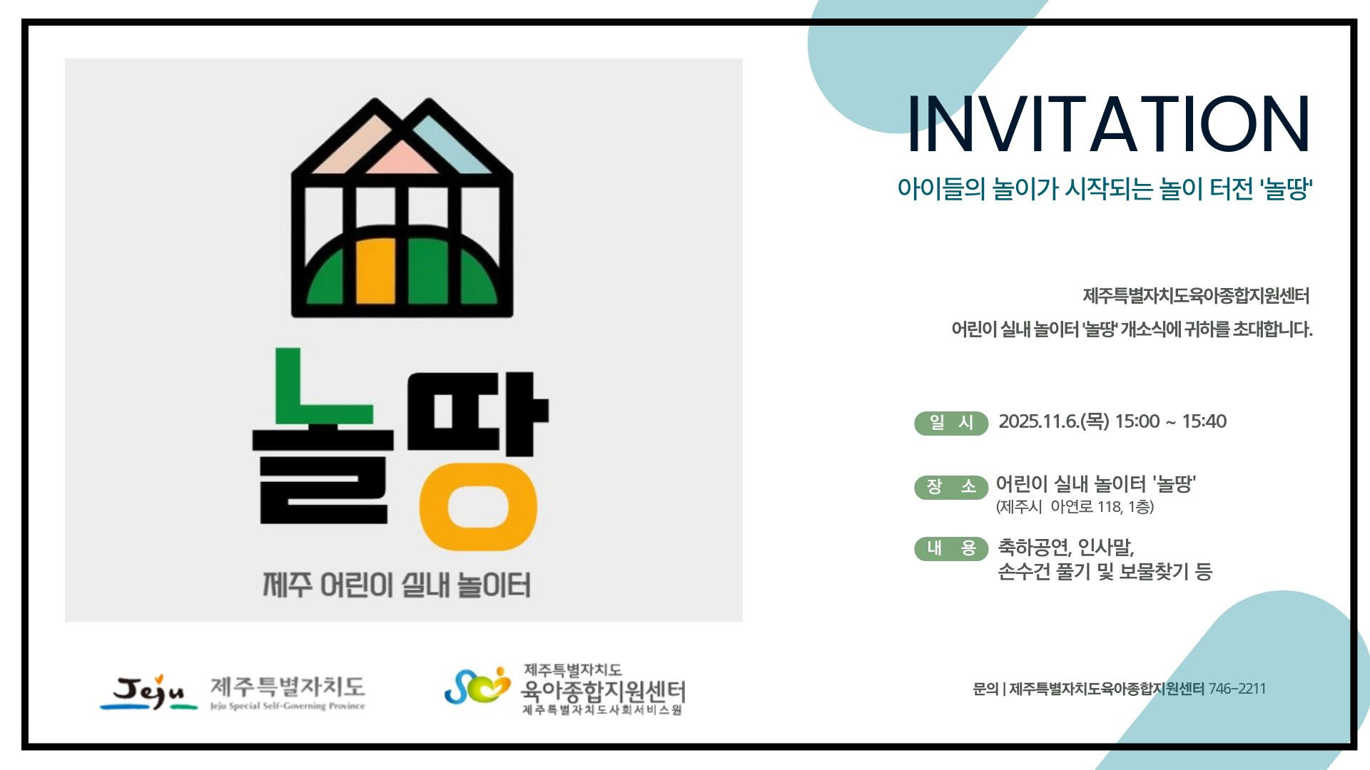 게시판 홍보마당 > 게시판 | 어린이 실내 놀이터 '놀땅' 개소식 안내에 대해 게시글의 제목, 작성자, 작성일, 조회수로 분류하여 정리한 표입니다. 어린이 실내 놀이터 '놀땅' 개소식 안내 작성자 관리자 작성일 25/10/28 (17:29) 조회수 21 실내놀이터 이용 안내: https://jeju.childcare.go.kr/ljeju/d19_10000/d19_25013.jsp 초대장-제주_어린이_실내_놀이터.jpg (208.9 KB) 목록으로