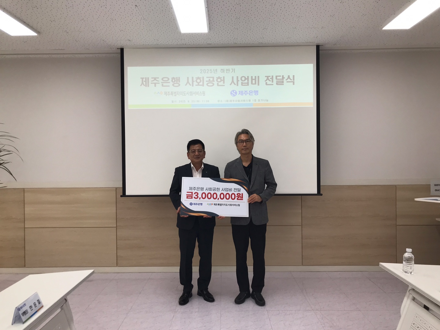 2025년 9월 23일, 제주은행에서 제주사회서비스원 직영시설 운영 사업비 3백만원을 후원했습니다.