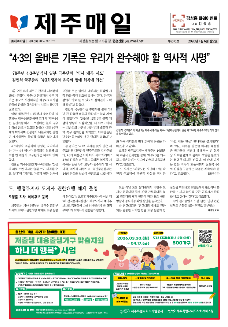 보도자료 보도자료 | [제주매일]저출생 대응 출생가구 맞춤지원 하나 더 행복+ 사업(지면)에 대해 게시글의 제목, 작성자, 작성일, 조회수로 분류하여 정리한 표입니다. [제주매일]저출생 대응 출생가구 맞춤지원 하나 더 행복+ 사업(지면) 작성자 관리자 작성일 26/04/07 (09:18) 조회수 22 제주매일저출생_대응_출생가구_맞춤지원_하나_더_행복+_사업_1.png (449.9 KB) 목록으로